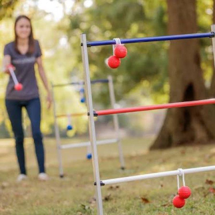 Ladderball, or "Hillbilly Golf", is a popular lawn game where 2-4 players toss weighted "bolas" (two balls connected by a string) at a three-rung ladder target located 15 feet away. The goal is to hook bolas onto the rungs, with points awarded based on difficulty (top=3, middle=2, bottom=1) and a winning score of exactly 21.